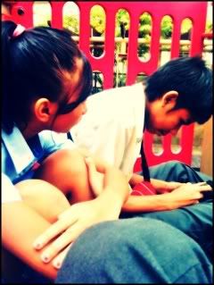 around 1.30pm, i took boipekk under his block. then slack together. sabo-ing eqa. she run everywhere the roofgarden. check2 abg dher dtg marah2 dher. ishkk !